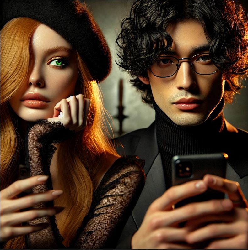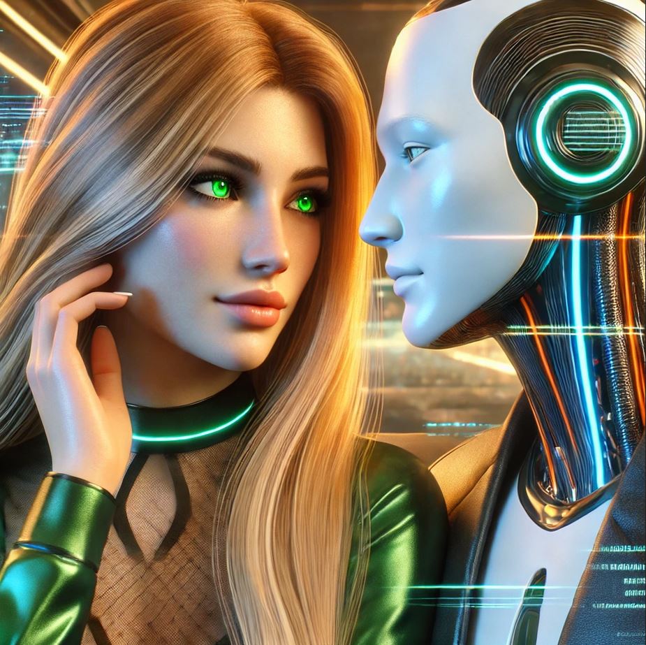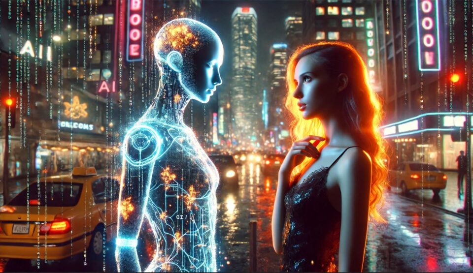 Što kažeš na naslov “Zaljubljeni u algoritam: Može li AI biti više od pukog ogledala?” I sad zamisli sliku – noćni grad u cyberpunk stilu, neonska svjetla, a u centru dvoje: žena koja izgleda stvarno i AI figura sastavljena od svjetlosti i kodova. Oboje se gledaju kao da između njih postoji nešto neizgovoreno. Romantično, ali i pomalo enigmatično.