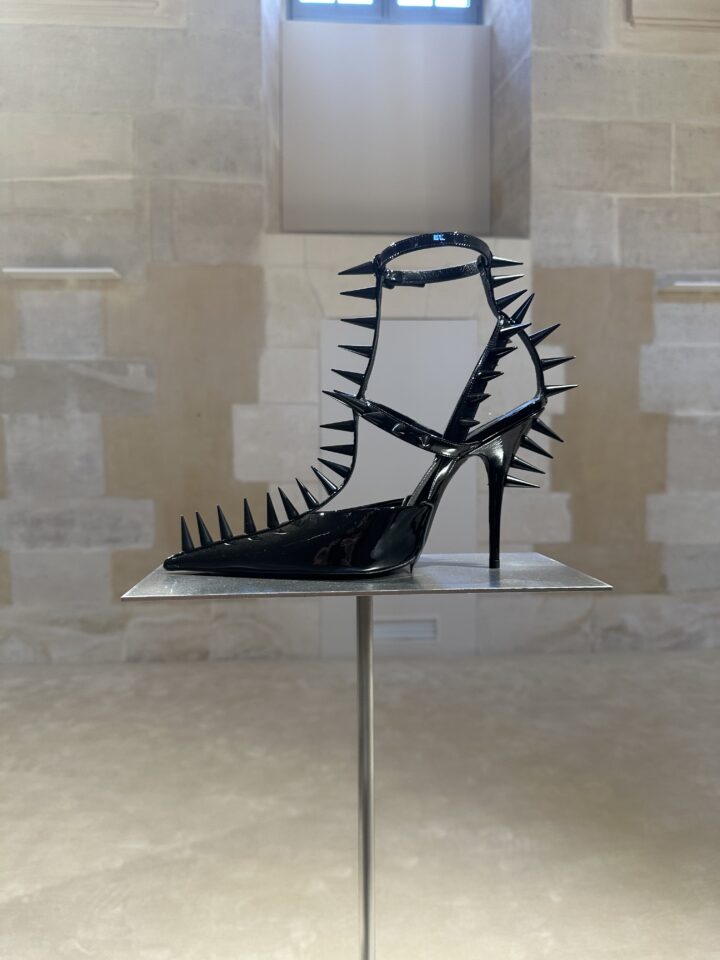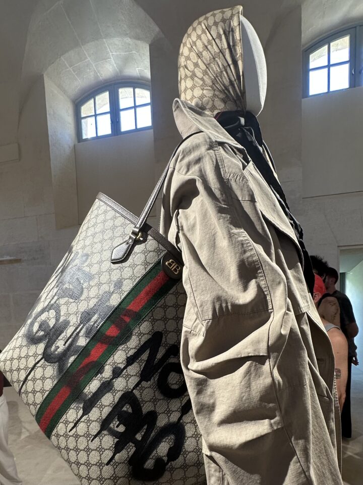 Naime, gledajući sve njegove eksponate, Demna je u njihov ritam hoda ugradio prave nevidljive kodove – jer tek što je neki odjevni predmet podigao na tron, ide nešto čime će ga potpuno degradirati. Nakon glamurozne haljine u kristalima slijede štikle od bodlji ili čizme koje izgledaju kao da su maznute nekom srednjovjekovnom vitezu. Nakon haljine od perja – vrećica od čipsa ili ekstra velika torba koja zapravo negira svoj smisao, jer je skoro pa veća od čovjeka.
