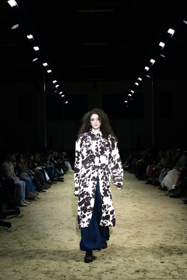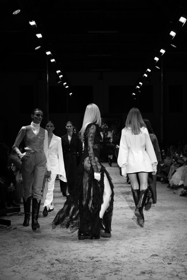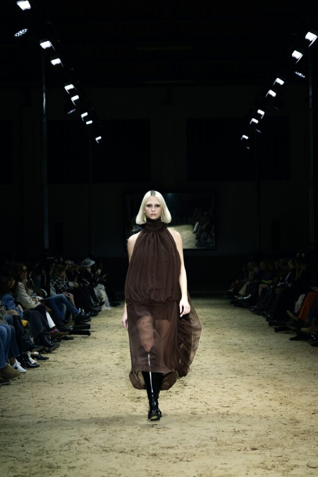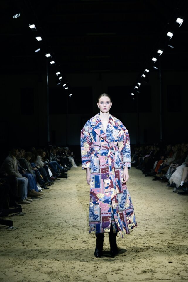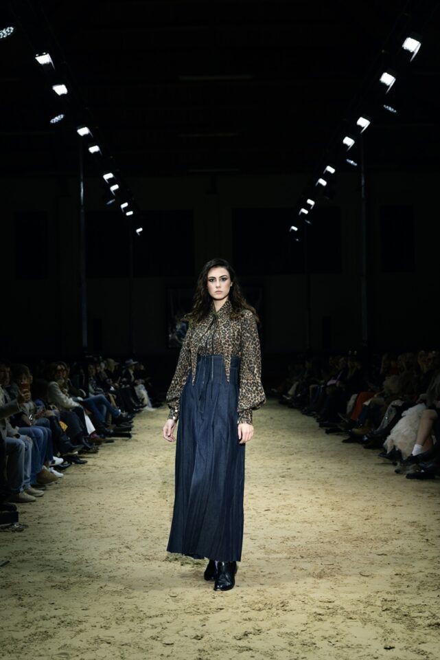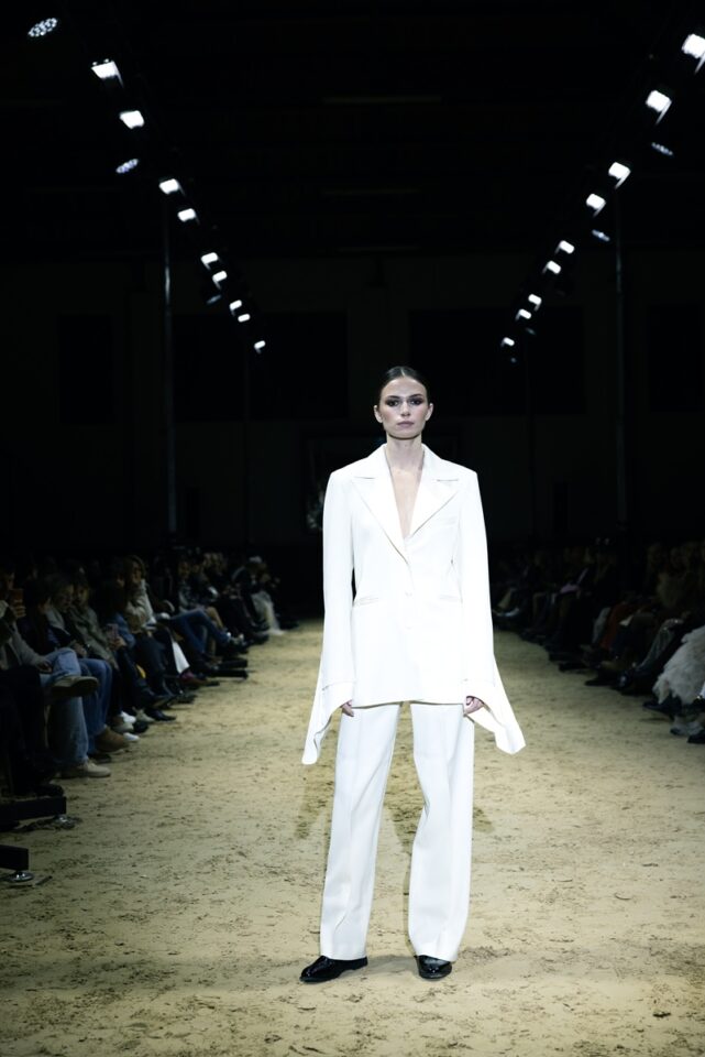 Ovo je linija koja slavi pokret i snagu: savršeno krojena odijela koja precizno grle siluetu, kaputi koji padaju s elegancijom, večernji komadi s naglaskom na senzualnost i dnevni outfiti spremni za prijelaz iz stabilnog u urbani ritam. Funkcionalnost dolazi kroz sportske elemente: traper hlačice i pamučne majice spojene s profinjenom svilom, čipkom koja dodaje misterij i najfinijim vunenim štofovima za toplinu. Paleta boja je sofisticirana: tamno plava i smeđa kao baza, crna i bjelokost za dubinu, uz detalje roze i zelene koji unose svježinu.